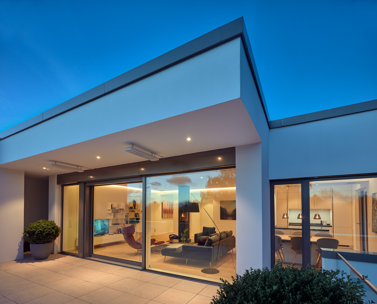 Die hochwertigen, größtenteils bodentiefen Holz-Alufenster sind 3-fach wärmeschutzverglast, mit elektrischen Sonnenschutz und einem erhöhten Einbruchschutz ausgestattet.